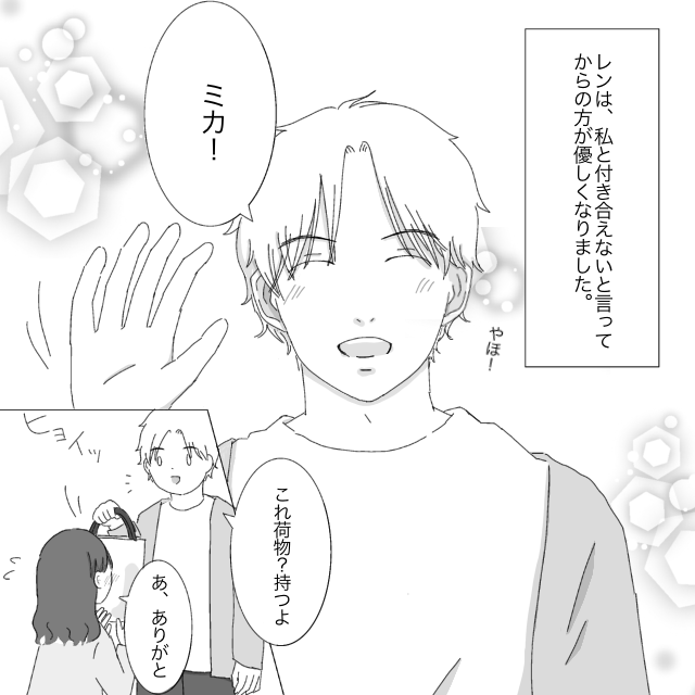 お互い好き同士だったものの、レンの過去の恋愛のトラウマが障害となり、恋人になれなかった私たち。その後は友人として関係を深めていき、気付けばお互いを呼び捨てで呼ぶほどの仲になりました。レンは、私に「付き合えない」と言ってからの方が優しくなった気がします。この日も「これ荷物?持つよ」と、私が持っていた荷物を代わりに持ってくれました。