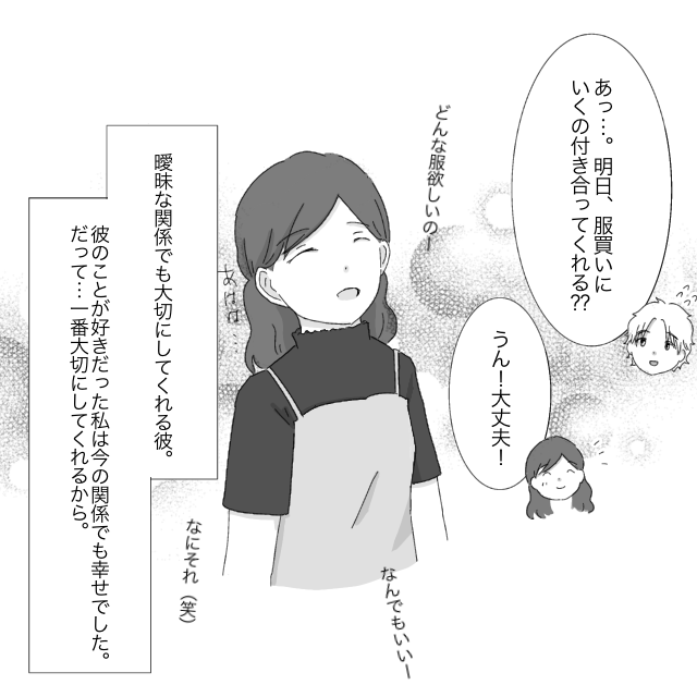 2人で映画に行ったり、ランチをしたり、たまにはお泊りもあったり・・・誰がどう見ても、私はレンの彼女のような存在でした。だけど私たちは付き合っていません。曖昧な関係に、私のモヤモヤは募っていくばかり。納得がいかない私は、レンに「ねぇ、私は彼女じゃないの?」と問いかけました。