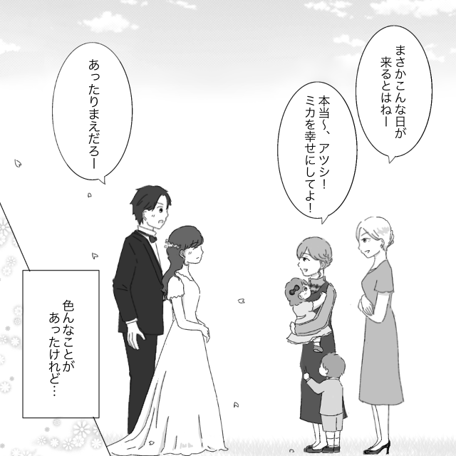 「まさかこんな日が来るとはねー」としみじみ言うカナコ。今は結婚して二児のママになったモカから「本当~。アツシ!ミカを幸せにしてよ!」と言われたアツシくんは「あったりまえだろー」と答え、私はみんなのやりとりを幸せな気持ちで聞いていました。レンと出会って恋をして、色んなことがありました。楽しいこともあったけれど、寂しい思い、悲しい思い、辛い思い・・たくさん経験しました。