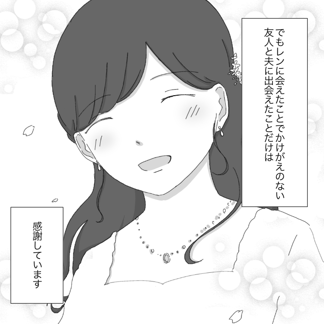 でも、レンに会えたことで、かけがえのない友人となったカナコとモカと、夫となったアツシくんに出会えたことだけは感謝しています。