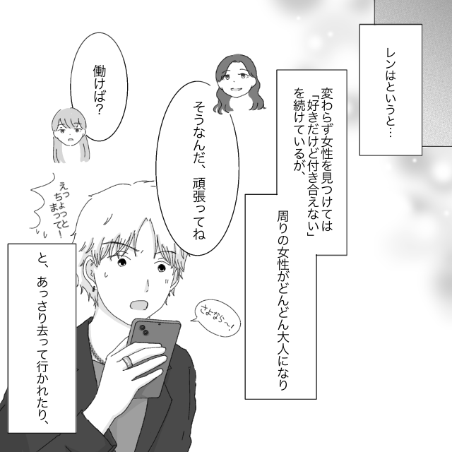 レンはというと・・相変わらず女性を見つけては「好きだけど付き合えない」を続けているそうですが、周りの女性がどんどん大人になり、「そうなんだ、頑張ってね」「働けば?」と言われてあっさり去って行かれたり、