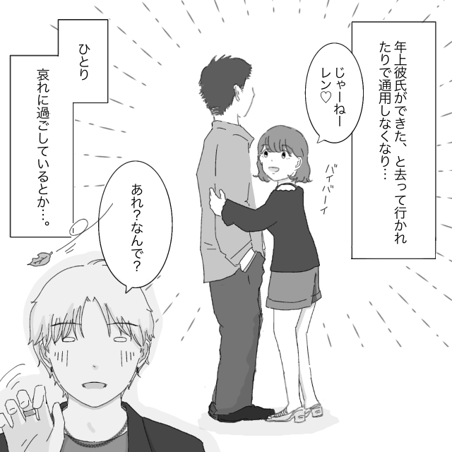 レンさんから都合よく利用され、何年も曖昧な関係を続けてしまった結果あっさり切り捨てられて深く傷ついたミカさん。傷心のミカさんを救ってくれたのは、レンさんの友達だったアツシさん、カナコさん、モカさんでした。数年後、ミカさんはアツシさんと結婚。カナコさんとモカさんはミカさんの親友になっていました。幸せになったミカさんとは反対に、「好きだけど付き合えない」が通用しなくなったレンさんは女性から相手にされなくなり一人ぼっちになっていました。