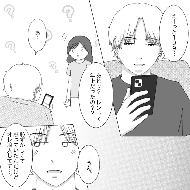 「えーっと199・・・」レンの口から出た生年月日は、私の一つ上。「あれ?レンって年上だったの?」と聞くと、レンは気まずそうに「あ・・・うん、恥ずかしくて黙っていたんだけど、実はオレ浪人してて」と言いました。
