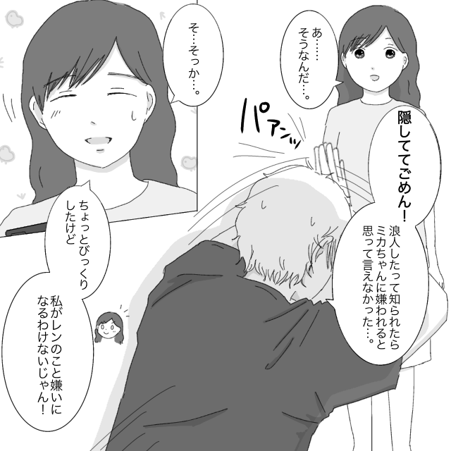 レンは頭上で両手をパンッと合わせて、「隠しててごめん!浪人したって知られたらミカちゃんに嫌われると思って言えなかった」と謝罪。私は少し戸惑いましたが「ちょっとびっくりしたけど、私がレンのこと嫌いになるわけないじゃん!」と言いました。なんで言ってくれなかったんだろう・・・と不安な気持ちが芽生えましたが、私に嫌われたくなかったと話すレンを見たら、どうでもよくなりました。
