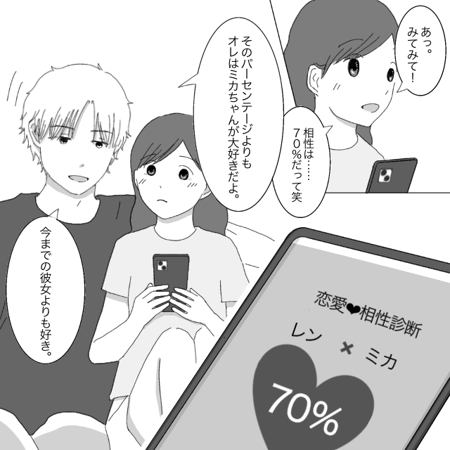 気を取り直して相性占いをすると、結果は70%。「見て見て、相性70%だって」とからかうように笑う私に、レンは真面目な表情で「そのパーセンテージよりもオレはミカちゃんが大好きだよ、今までの彼女よりも好き」と言いました。