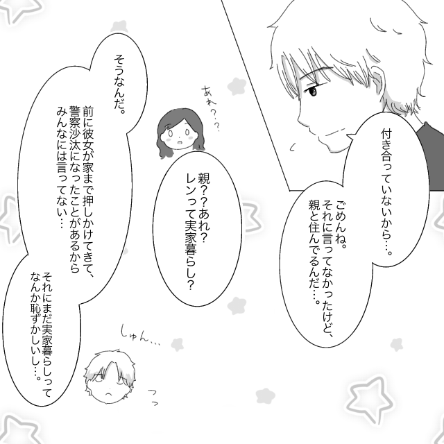 しかし、案の定「付き合っていないから・・・ごめんね、それに言ってなかったけど親と住んでるんだ」と断られてしまいました。「あれ、レンって実家暮らし?」と聞いた私に、「前に彼女が家まで押しかけてきて、警察沙汰になったことがあるからみんなには言ってなくて・・・それにまだ実家暮らしってなんか恥ずかしいし」としょんぼりした様子で言いました。