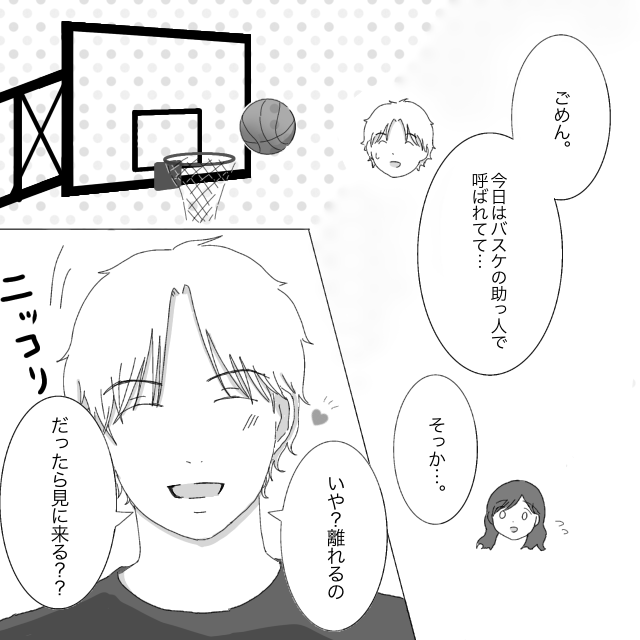 「ごめん、今日はバスケの助っ人で呼ばれてて・・・」と申し訳なさそうなレン。今日は一緒にいられないんだ・・・と落ち込む私を見て、レンはひらめいたように「オレと離れるのがいやなら、バスケの試合見に来る?」と言いました。