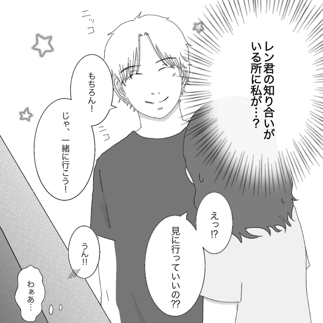 「えっ!?見に行っていいの?」と驚く私に「もちろん!じゃ、一緒に行こう!」と笑顔で言うレン。突然の事で戸惑いましたが、レンの知り合いに自分を紹介してもらえる・・・それだけで特別な存在になったような気がして嬉しくなりました。
