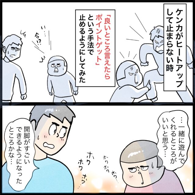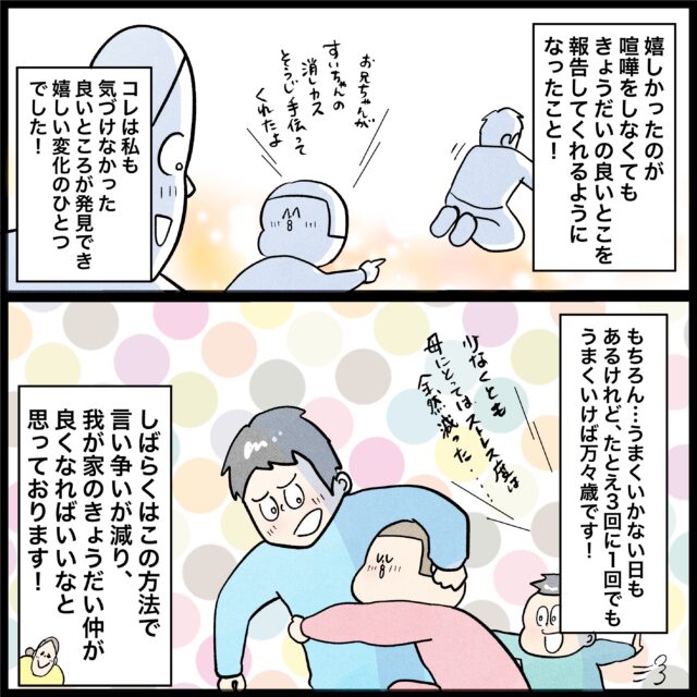 わぁ!なんて素敵な作戦!さっそく我が家にも取り入れたいと思いますー!本当に驚くほど些細なことで喧嘩しますよねぇ・・・(汗)
