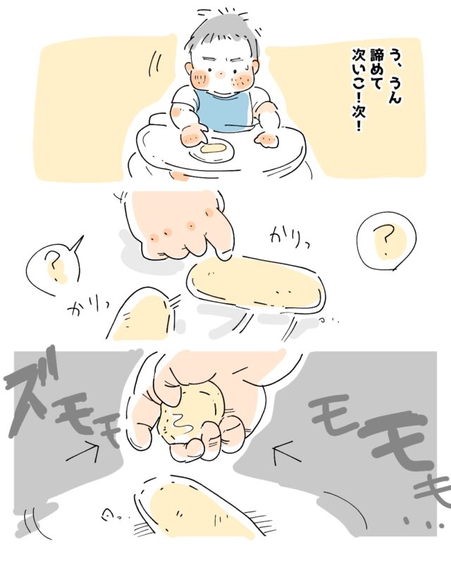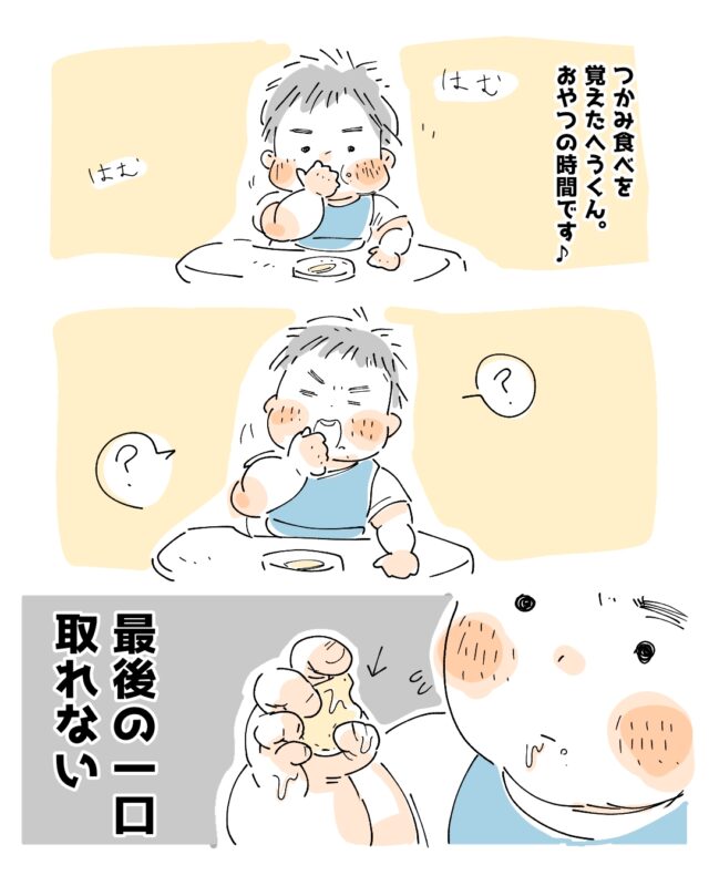 3歳の女の子くうちゃんと0歳の男の子へうくんのママであるマキノ(@warabeams)さんから、へうくんのつかみ食べのお話です。最近はじめたつかみ食べ、へうくんは上手に食べられているのでしょうか?