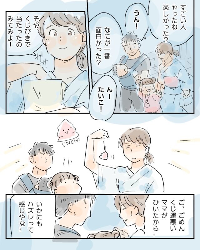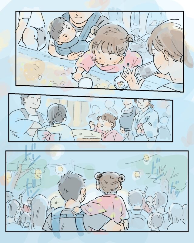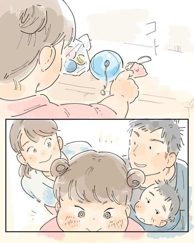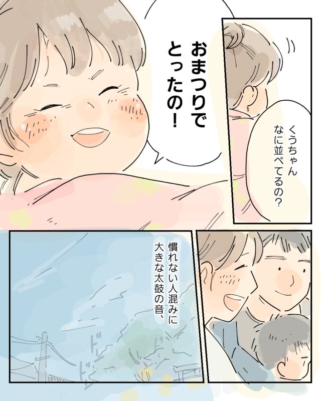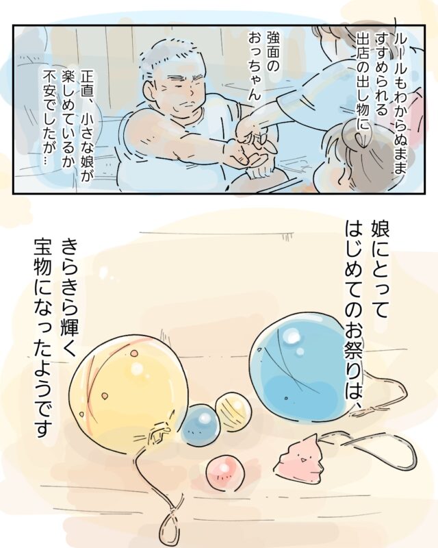 くうちゃんの初めての夏祭りいい思い出になりましたね~!ママから貰った景品も宝物になりましたね。ほっこりしました!