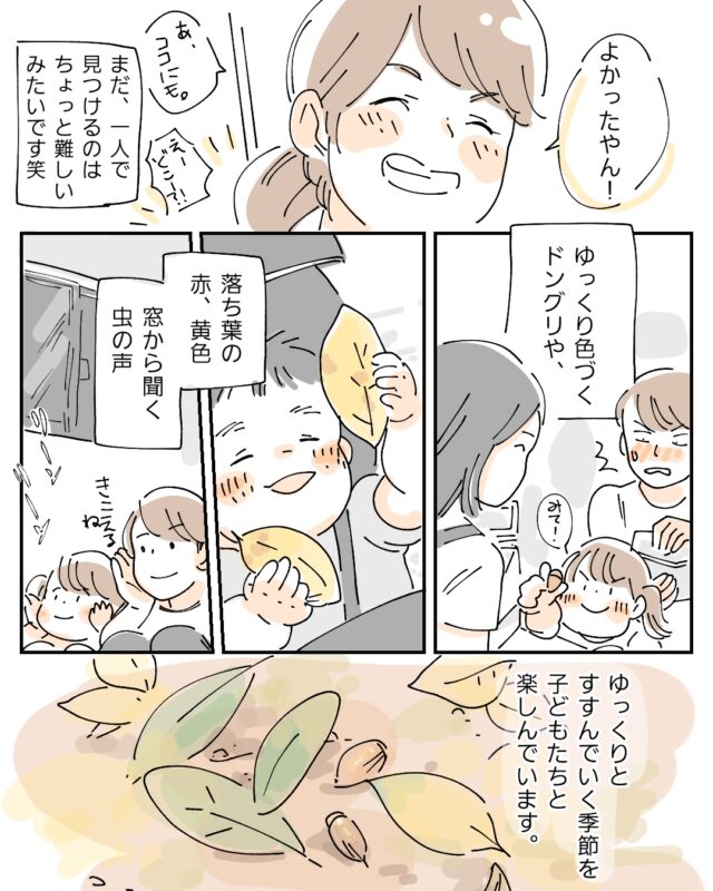 3歳の女の子くうちゃんと0歳の男の子へうくんのママであるマキノ(@warabeams)さんから、少しずつ近づく秋の訪れを感じたお話です。季節の移り変わりを実感する豊かな時間の過ごし方、教えてください。