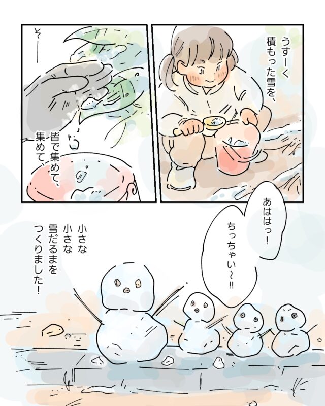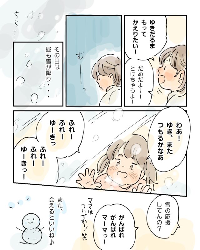 雪があまり降らない地域で雪が降ると子ども達はテンションが上がりますね!くうちゃんは家族みんなで雪で遊んだことがとっても楽しかったのでしょうね!また積もるといいですね~!