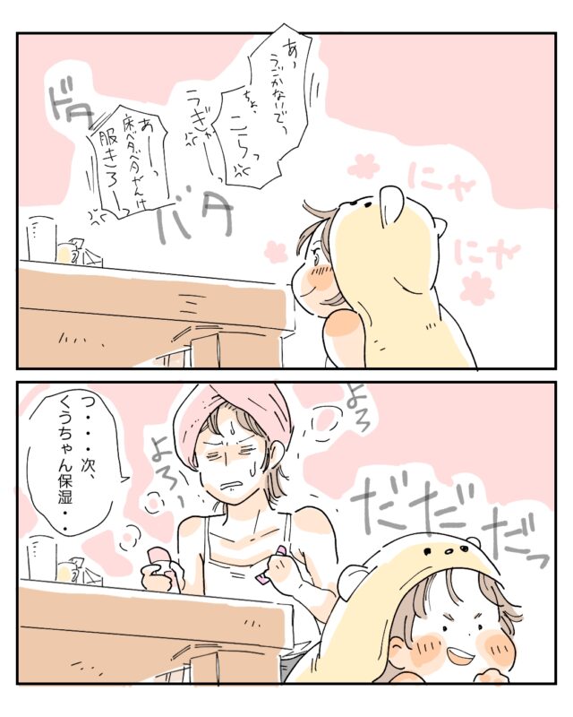 子どもが小さいうちはお風呂上がりもママは自分のことはそっちのけで子どもの保湿や着替えでてんやわんやですよね。そんなバタバタなひとときに、くうちゃんが何気なくやった行動でキュンとなったマキノさん。何があったのでしょうか?