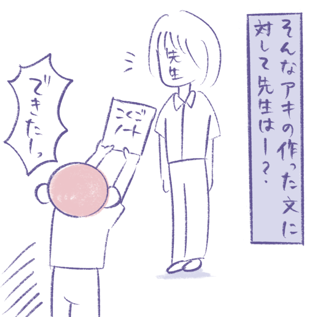 あはは!アキくん、おもしろすぎますー!こんなドラマチックな文が作れるなんて・・・さすがアキくん!そして、先生の注目ポイントとコメントも・・・(笑)息子のクラスにアキくんがいたら・・・とっても楽しそう!!
