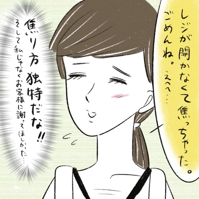 ブリトーのお店で一緒に働くまるさんと同僚・細田やよいさん。お客様から「おつりもらってないんですけど」と言われたやよいさんは「レジが開かないのでおつりは出ません」と真顔で返答。まるさんが開け方を伝えレジは開きましたが・・・やよいさんはお客様に一言の謝罪もせず何事もなかったかのようににっこり笑顔でおつりを返したのでした・・・。