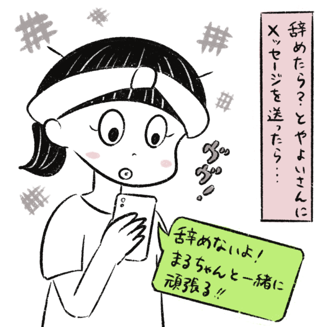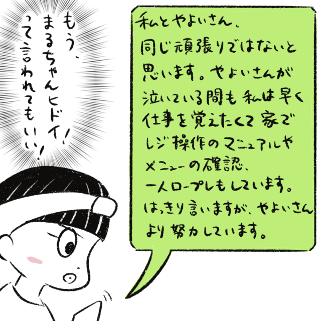 ブリトーのお店で働き始めたまるさんは、同僚やよいさんの対応に頭を悩ませていました。社員さんに褒められている他のパートやアルバイトを見て「ズルい」「ひいきだ」と不平不満ばかりのやよいさん。ネガティブなメッセージばかり送ってくるやよいさんに我慢の限界に達したまるさんは、とうとう「そんなにしんどいなら辞めて違う仕事を探されては?」とメッセージを送信・・・!