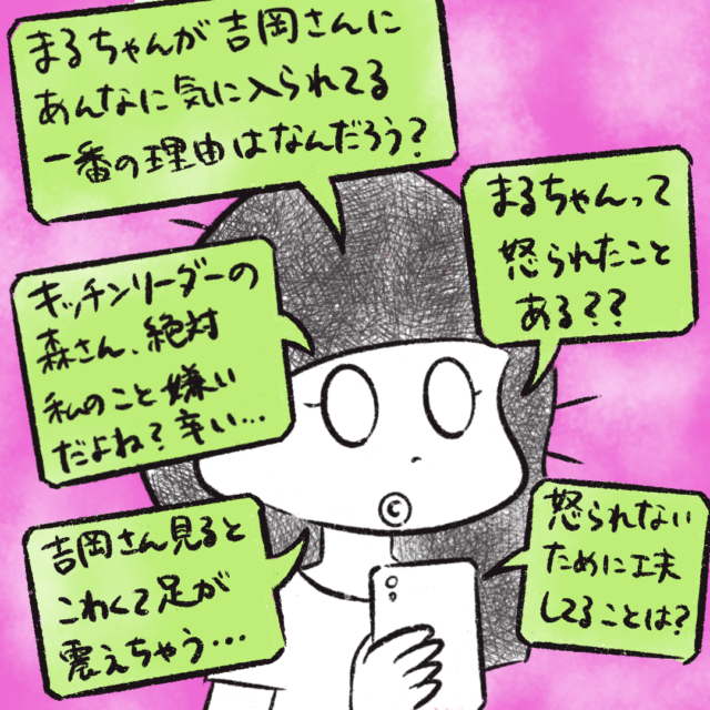 ブリトーのお店で働き始めたまるさんは、同僚やよいさんの対応に頭を悩ませていました。社員の吉岡さんの言動に対し「ズルい」「ひいきだ」と不平不満ばかりのやよいさん。パートが辛いというネガティブなメッセージばかり送ってくるやよいさんに我慢の限界に達したまるさんが「そんなにしんどいなら辞めたら?」と伝えるも辞めずに頑張ると言います。しかし、どうしたらまるちゃんみたいになれる?まるちゃんのやっていることを覚えたら褒められるよね?と自分で考えようとしないやよいさんに「自分で考えて」と伝わるようにメッセージを送ってやり取りを強制終了しました。