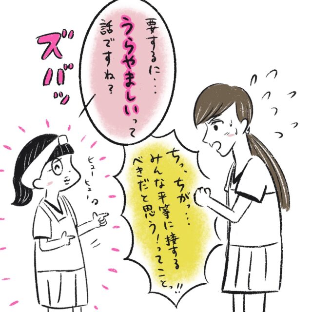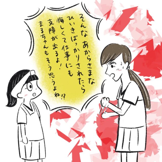 ごみ箱に入っていたチョコの空箱を見ただけで社員の吉岡さんが自分に嫌がらせをしていると被害妄想を膨らませるやよいさんに、まるさんは「勝手な思い込みで吉岡さんを悪く言うのは違う」と正論をぶつけます。チョコの空箱が捨ててあったことについて様々な可能性を伝え「吉岡さんを疑ったことに対してどう思いますか?」と問うまるさんに言葉が出ないやよいさん・・・。