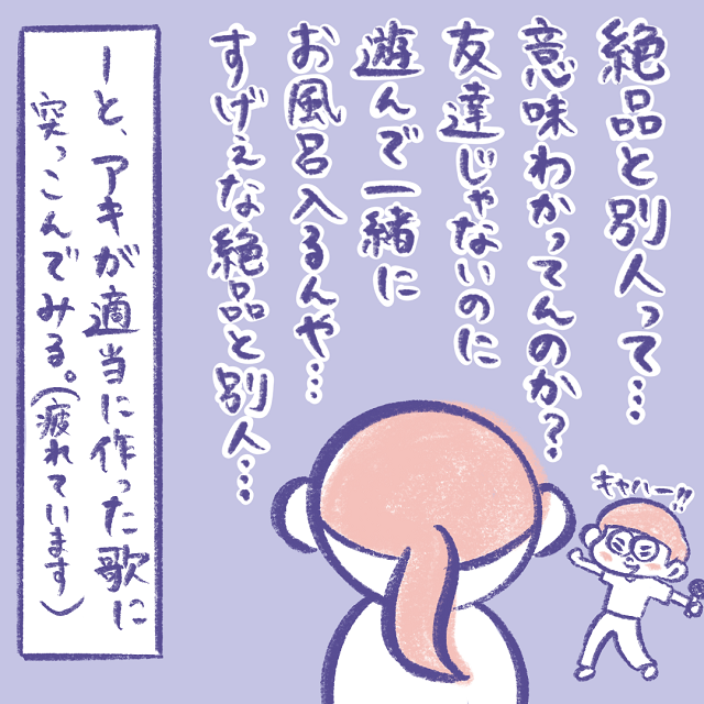 すげぇな、絶品と別人(ていうか、誰?)・・・。息子作の歌に冷静に突っ込む母|まるの育児絵日記 2021年08月02日 すげぇな、絶品と別人(ていうか、誰?)・・・。息子作の歌に冷静に突っ込む母 夏の新曲発表! 「絶品と別人は友達じゃない」 張り切ってどうぞっっっ!! ちなみにメロディラインはとても楽しい感じであります。 いつか皆様に生歌をお聞かせできる日が・・・ 来ないな・・・。 まる 5歳の面白息子アキを育てるアラフォー母です。 この記事をSHAREする この記事のカテゴリー マンガ子育て園児