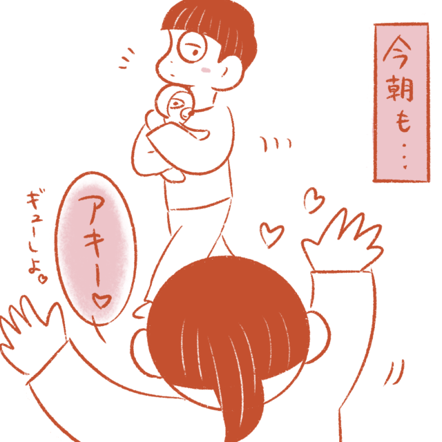 まるさんと息子アキくんの朝の日課は、おはようのギューをして愛を伝えること。最近はまるさんからの「愛してるよ」の言葉になぜか「小笠原くん」と返すようになったアキくんを謎に思いながらも、可愛いからまぁいいや!と思っているまるさん。この日課はアキくんが生まれてから7年間続いているそうなのですが、ある日いつものようにギューからの愛の言葉を伝えていたら・・・?