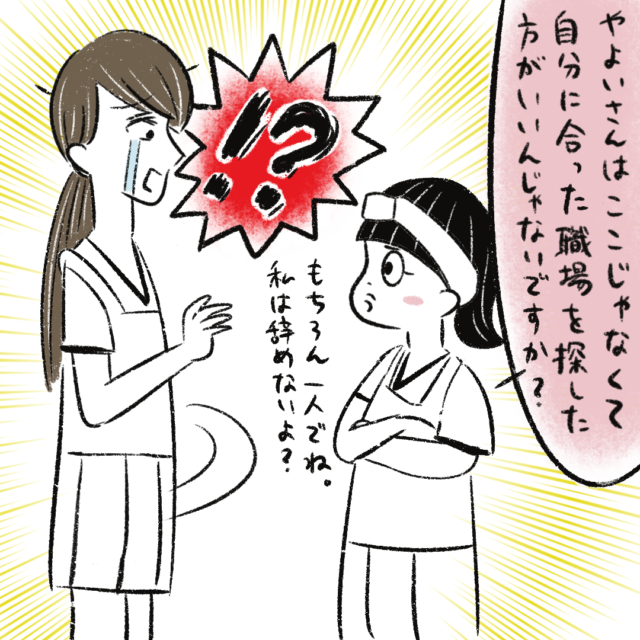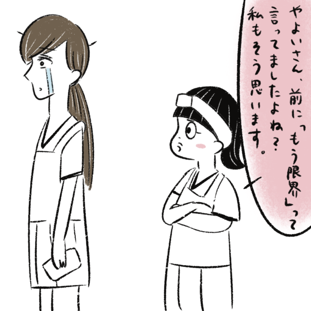 パワハラ・・・ではないですね・・・。まるさんに優しい言葉をかけて欲しかった様子のやよいさんですが、やよいさんご本人も含めてみんなが限界ならば、はやり働きやすい場所を探した方がもう泣かなくても済むかもしれませんね。