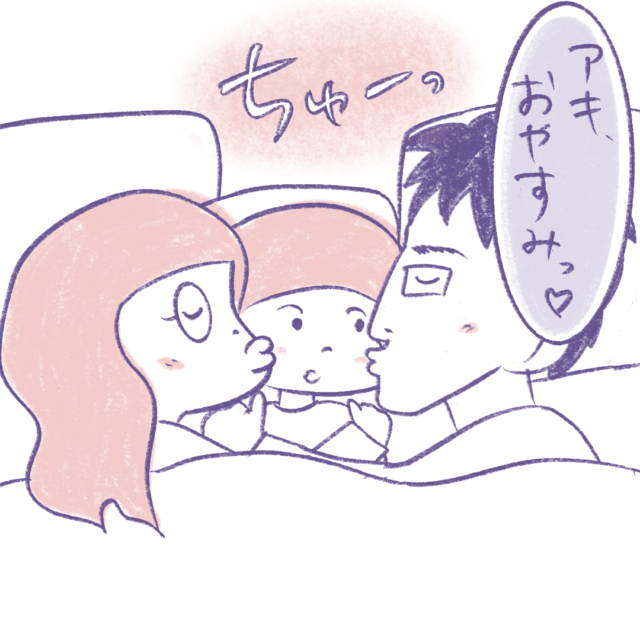 寝る前にいつもアキくんにチューをしているというまるさん。この日はお父さんからもチューをされたアキくんは・・・?