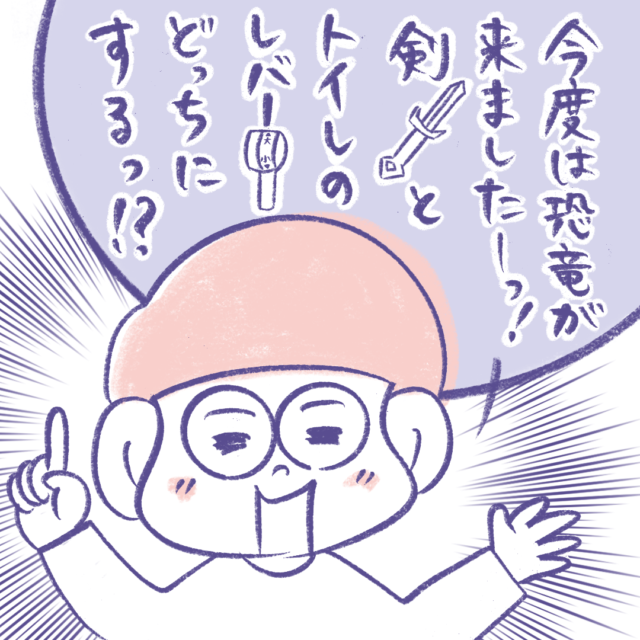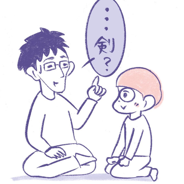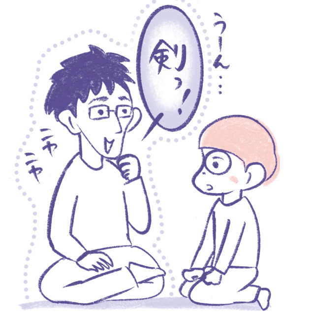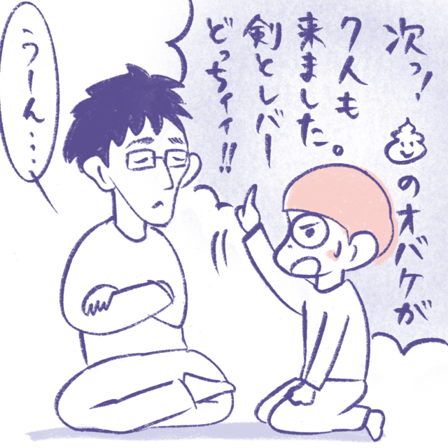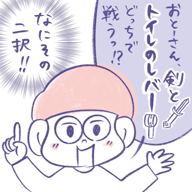 まるさんが夜ご飯を作っているときに聞こえてきたアキくんとご主人の会話。なになに?剣とトイレのレバー!?なにその二択ー!!