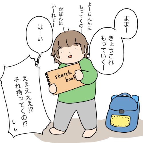 この頃登園を渋ったりしてなかなか家を出るのが大変だったので、持って行きたいという気持ちを汲み〝カバンから出さないこと〟を条件に持って行かせました。