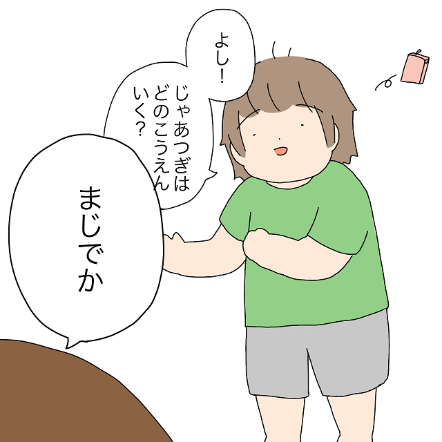 大体ごねて数時間疲れ果てるまで遊ぶか、泣きながら強制帰宅か(体力勝負)。