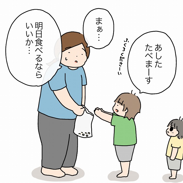 ちゃんと「明日食べるから袋ください」が言えたので良いか・・・と袋に入れてあげることにしました。