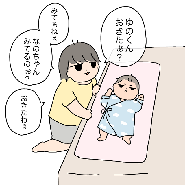 朝起きたら弟の所に行き、おはようを言うなのちゃん。