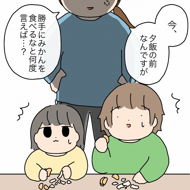 すぐ「おなかいっぱい~」「ごはんたべれない~」などと言うので、夕飯の前は食べ物を控えさせています。なのにちゃっかりと二人してみかん食べてる!!