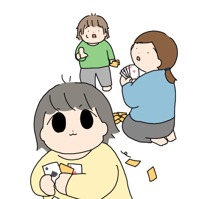 ババ抜きをマスターした長女はもう一人で立派なプレイヤーになれますが、ルールをいまいち把握できていない次女は一人でゲームに参加する事が出来ず、チームになって大人と一緒に参加するか見ているかのどちらか。