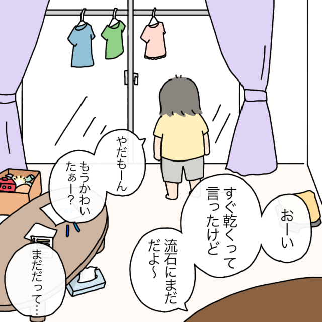 4歳めのちゃん、2歳なのちゃん、0歳ゆのくんの3人のお子さんを育てるめめ(@Naru9nari)さんから、なのちゃんと洗濯物のお話です。