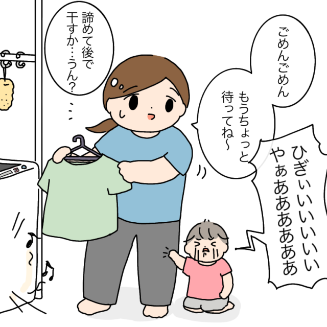 どうしようかな?一旦中止して落ち着くまで抱っこしてようかな?それかおんぶして干すか・・・