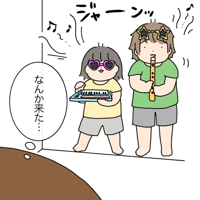 おもちゃの笛におもちゃのピアノ、其々お気に入りのサングラスをかけて長女、次女が洗面所の入り口に立っていました。