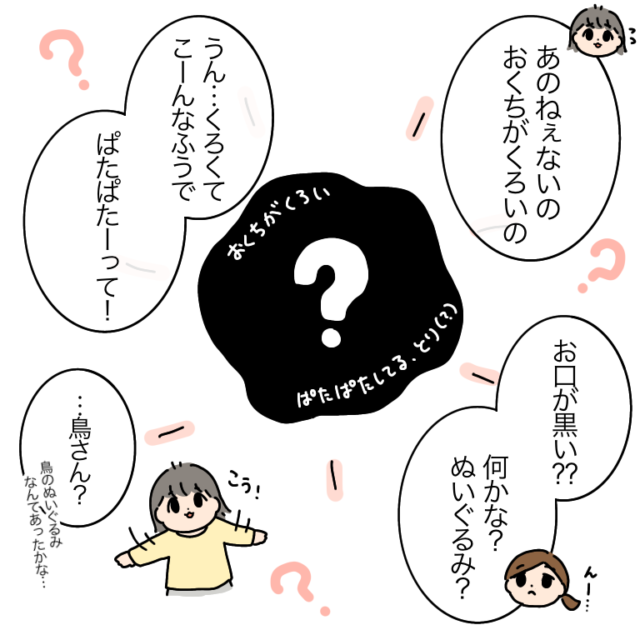 「何の動物?」と聞くも返ってくる答えは同じ「おくちがくろくて、パタパタしてるやつ」。