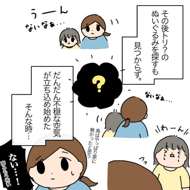 5歳めのちゃん、3歳なのちゃん、0歳ゆのくんの3人のお子さんを育てるめめ(@Naru9nari)さんから、次女なのちゃんの探し物のお話です。なのちゃんは一体何を探しているのでしょうか?
