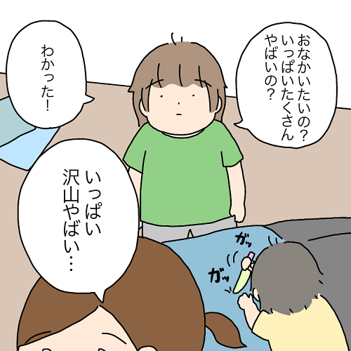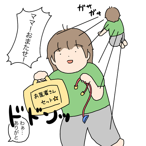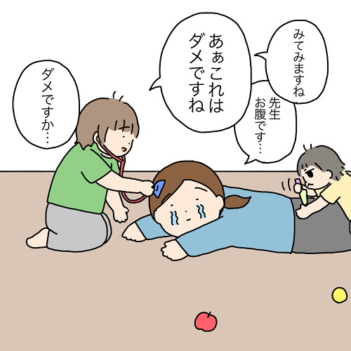 ちびっこ医者登場|めめの育児絵日記 2020年06月29日 子どもを二人みながらの突然の体調不良…母だってたまにはお腹も痛くなります。 異変を察知した2歳さんがどうやら気にしている様子!ありがたい! ママお腹が痛いからね… 出来ればそっとしておいてほしい…むりかな… ちびっこ医者登場 診察の結果、手遅れとのこと… なんてこった! って頭だし!ナンテコッタ でもお医者さんセットを持ってきてくれるなんて、ちょっと優しい。そんな娘にキュンときた1日でした。 ママがんばるからね! この記事をSHAREする この記事のカテゴリー 子育て幼児