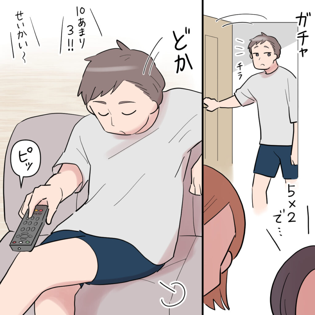 そこへ夫がやってきました。チラッと私たちのほうを見た夫は、何も言わずそのままソファへ行くと、どかっと腰をおろしてテレビをつけました。