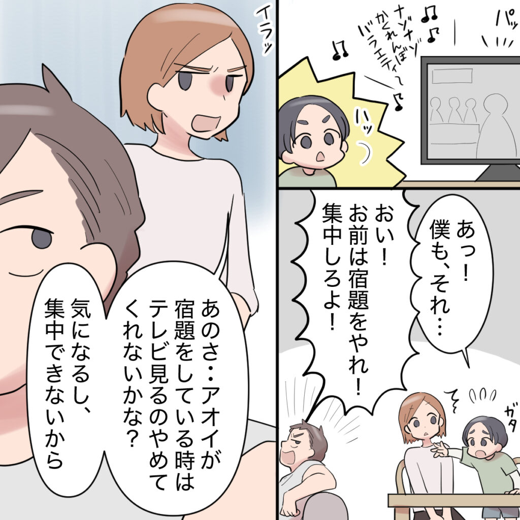 『ナゾナゾかくれんぼバラエティ~』テレビから楽しそうな声が聞こえてきて、アオイがハッと顔を上げます。「あっ!僕もそれ・・」と言って立ち上がると、夫が大きな声で「おい!お前は宿題をやれ!集中しろよ!」と叱りました。夫の行動にイラっとした私が「あのさ・・アオイが宿題をしている時はテレビ見るのやめてくれないかな?気になるし、集中できないから」と言うと、