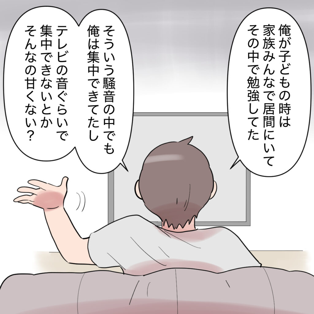 夫はこちらを見もせず「俺が子どもの時は家族みんなで居間にいてその中で勉強してた。そういう騒音の中でも俺は集中できてたし、テレビの音ぐらいで集中できないとかそんなの甘くない?」と言ってテレビを見続けます。