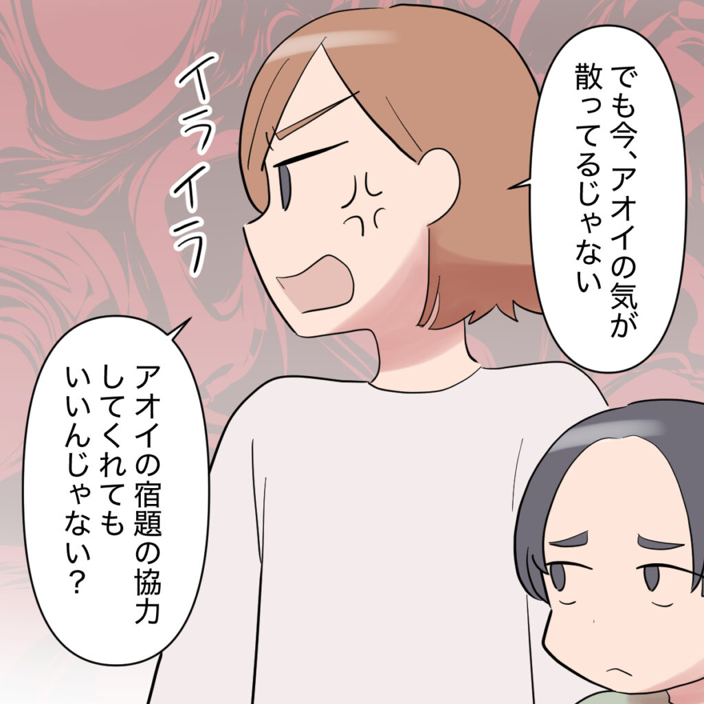 私はそんな夫の態度にますますイライラして「でも今、アオイの気が散ってるじゃない。アオイの宿題の協力してくれてもいいんじゃない?」と言いました。