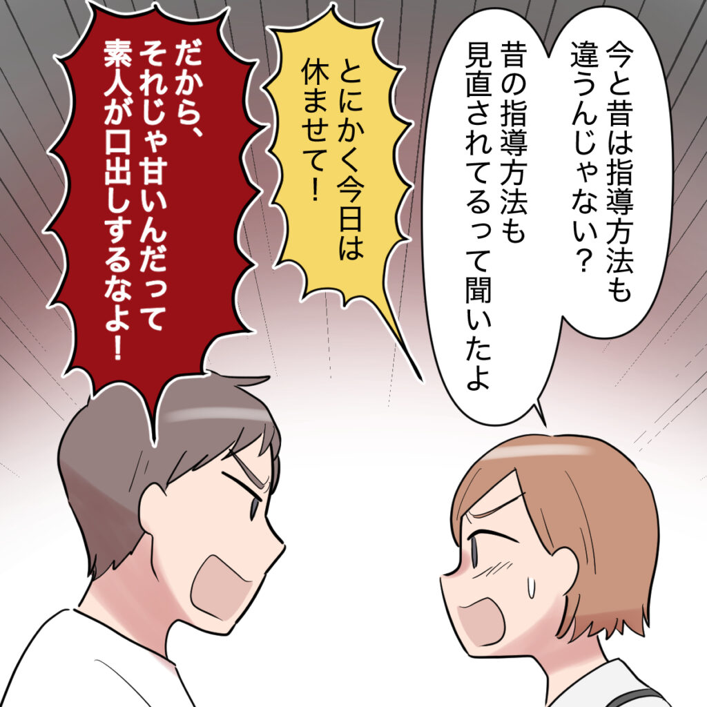 「今と昔は始指導方法も違うんじゃない?昔の指導方法も見直されるって聞いたよ。とにかく今日は休ませて!」私が訴えると、「だから、それじゃ甘いんだって。素人が口出しするなよ!」と夫が強い口調で反論しました。