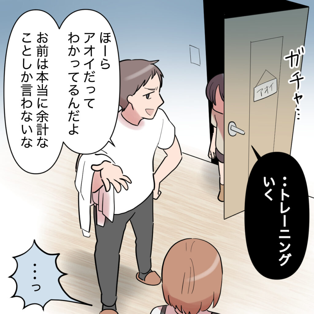すると、「・・トレーニングいく」リビングのドアが開いて、アオイが!すると「ほーらアオイだってわかってるんだよ。お前は本当に余計なことしか言わないな」と夫が調子に乗って言いました。