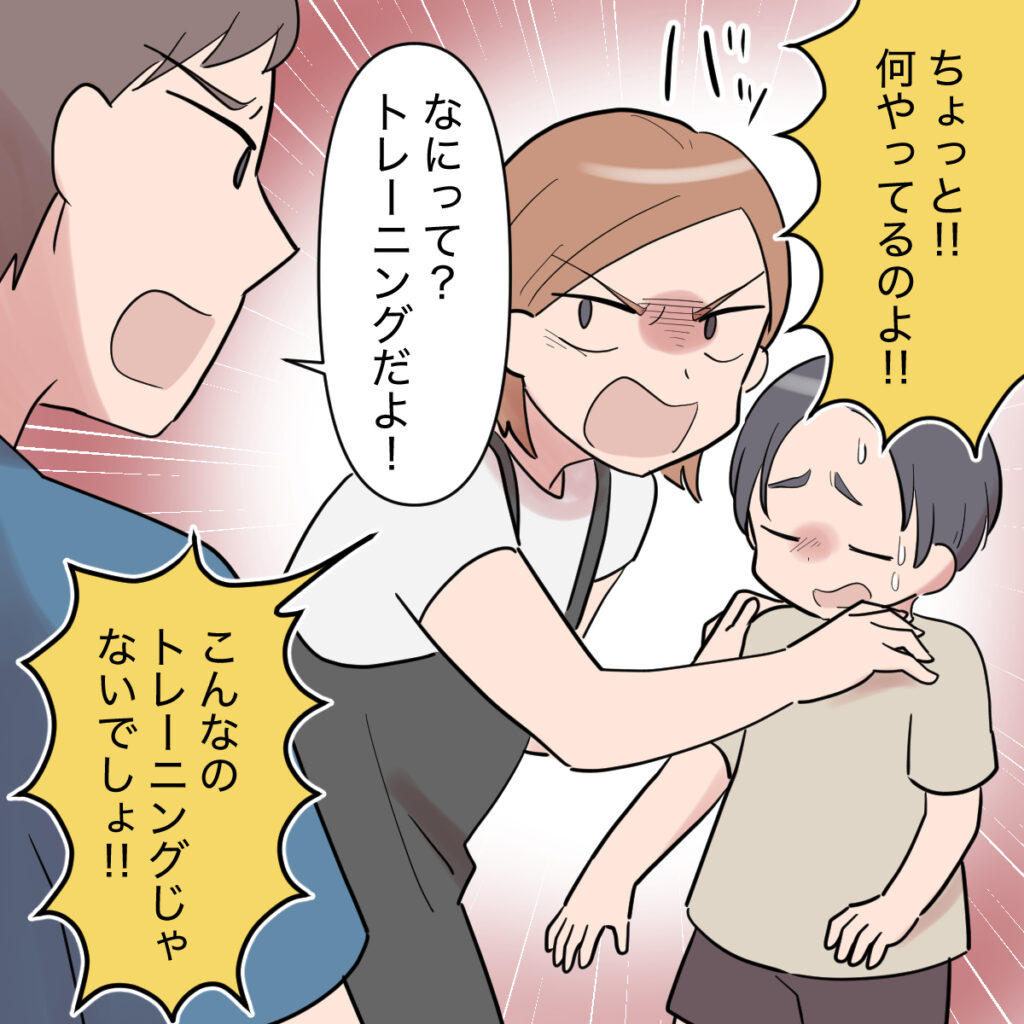 怒鳴る夫に私は急いでアオイの元へ駆けつけました。「ちょっと!!何やってるのよ!!」と夫に言うと夫は「なにって?トレーニングだよ!」と自分がアオイにどれだけヒドイことをしているか全く気付いていないようでした。私が「こんなのトレーニングじゃないでしょ!!」と言うと・・・