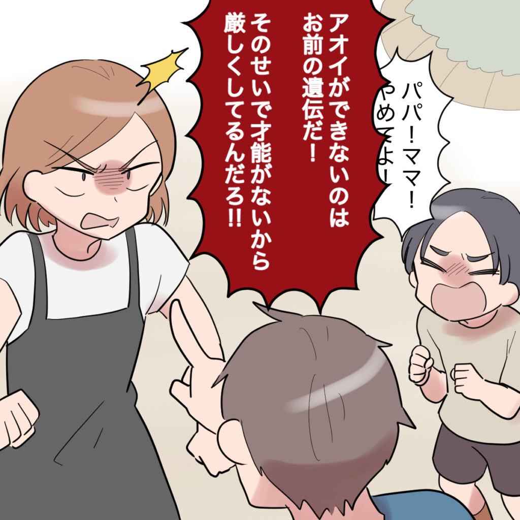 アオイは「パパ!ママ!やめてよ!」と止めてくれていましたが、私も夫もカッとなっておりアオイの声は聞こえていませんでした。そして夫は「アオイができないのはお前の遺伝だ!そのせいで才能がないから厳しくしているんだろ!!」と言い始めました。