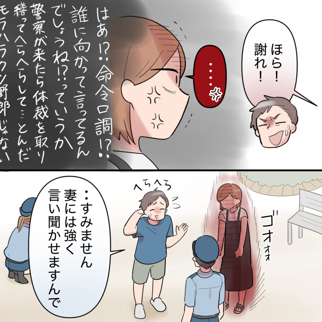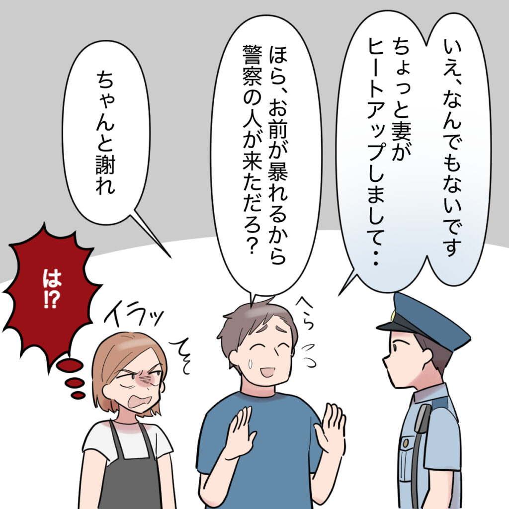 「ほら!謝れ!」と繰り返す夫。はぁ?命令口調!?誰に向かって言ってるんでしょうね!?っていうか警察が来たら体裁を取り繕ってヘラヘラして・・・とんだモラハラクソ野郎じゃない!・・・心の中で怒りが煮えたぎっている私は、かろうじて黙っているのが精いっぱい。そんな私を前に夫は「すみません、妻には強く言い聞かせますんで」とまだヘラヘラと言っています。