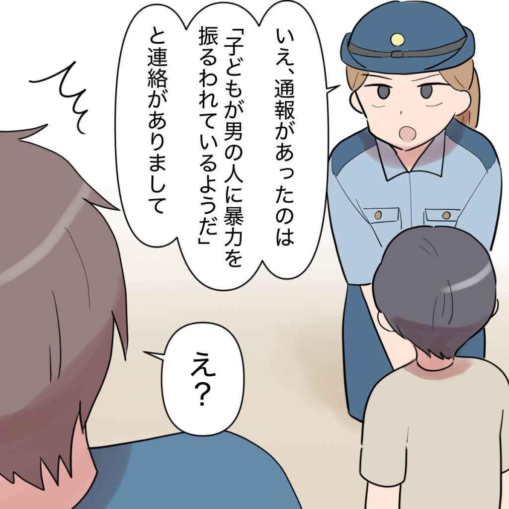 すると、後から来た女性警察官が厳しい口調で「いえ、通報があったのは、『子どもが男の人に暴力をふるわれているようだ』と連絡がありまして」と真っ直ぐに夫を見据えて伝えたのです。